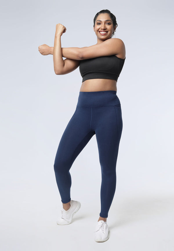 Prepare to flaunt your curves with our sleek and flexible leggings. These form-fitting navy blue trousers are designed to hug your body and provide optimum flexibility and support during your workouts. You can mix and match them with your favourite tops for a stylish athleisure appearance thanks to the flattering high-waisted silhouette.