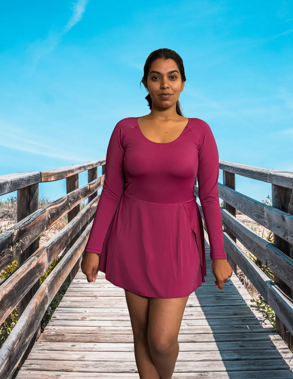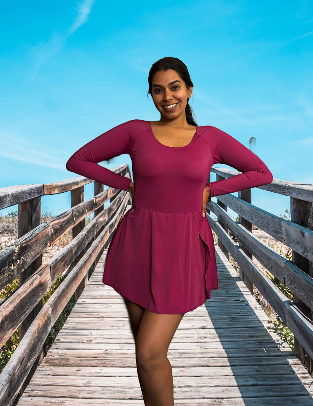 Say hello to a swimsuit that captures versatility & high coverage perfectly. Featuring full sleeves for sun protection & in-built stitched cups that don’t move around. Swim freely with in-built shorts that don’t ride up, coupled with a playful skirt design. Built to flatter all your curves with a cinched waistband & stylish overlapped slit for ease of movement. Swim & beat the heat with a swimsuit designed for Indian curves.